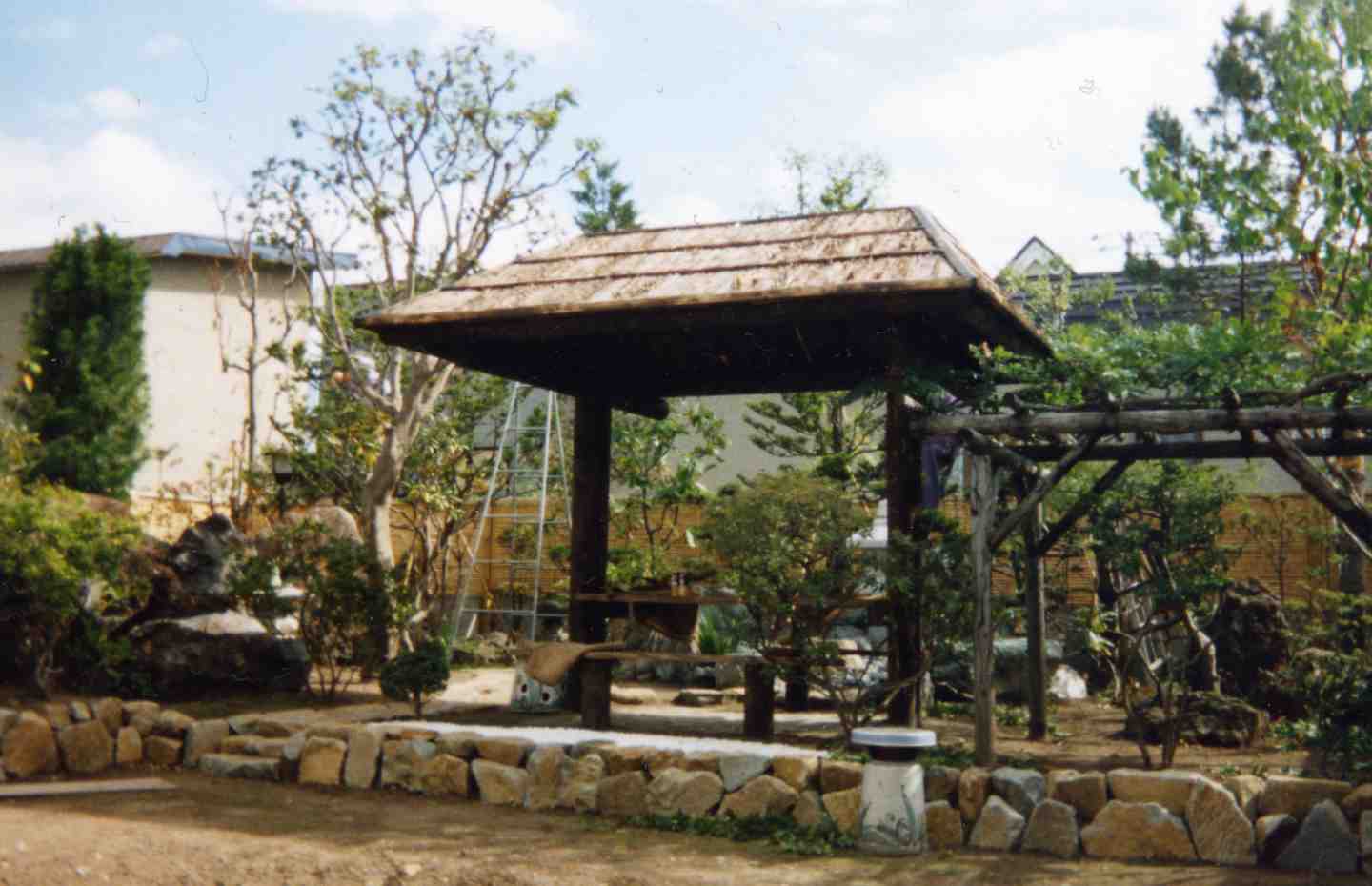 こちらは東屋です。夏の暑い頃、ここに来て涼みながら休むとなかなか気持ちのいいものがあります。夕方、東屋を遠くから見ると、また違ったお庭の風景が見られます。